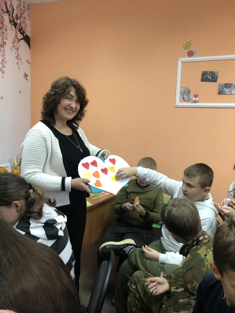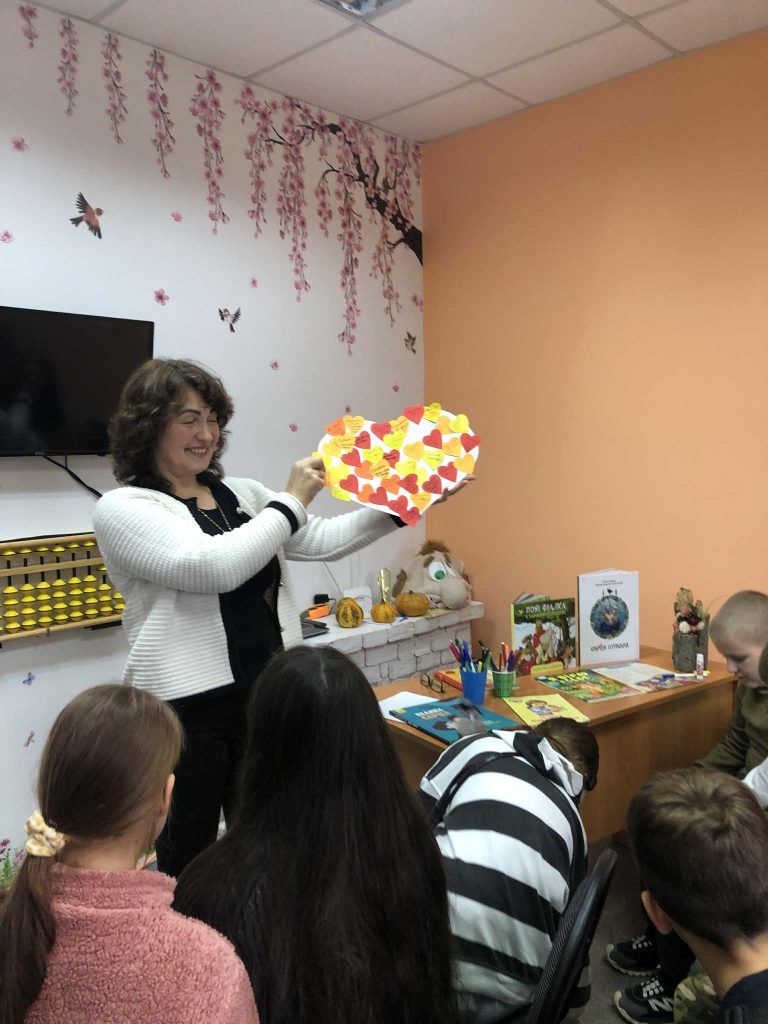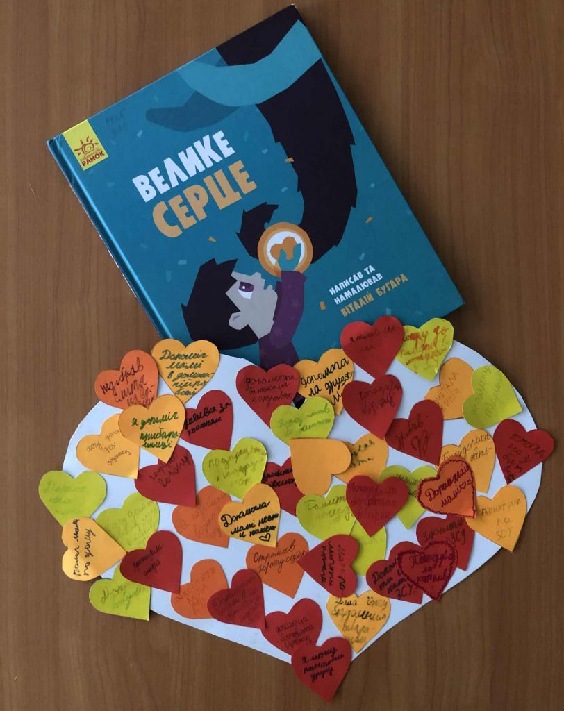 А на завершення, бібліотекар провела арт-терапевтичну практику «Велике серце доброї людини». Дітям запропонували створити своє «серце добрих справ», у якому кожна дитина залишила частинку власного тепла, і з тих сердечок народилося велике серце доброї людини.
