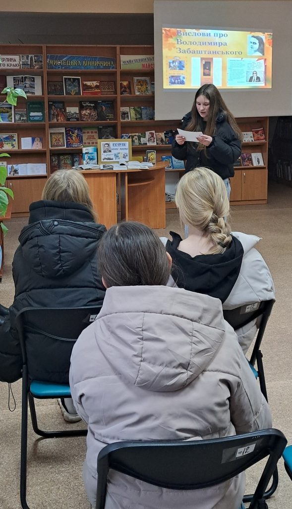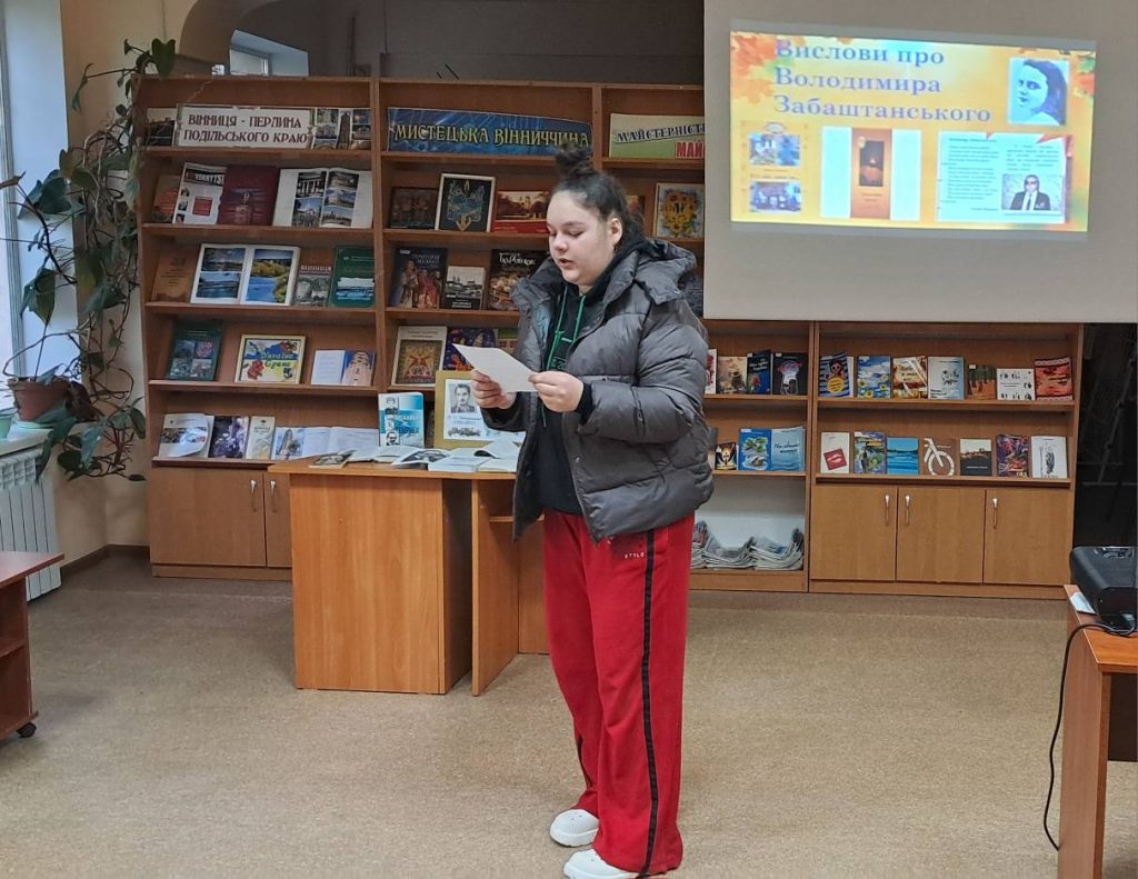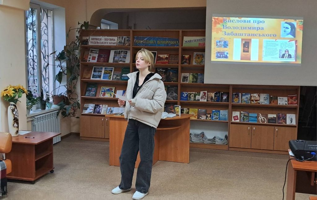 Наша рідна подільська земля виплекала багато талановитих поетів та письменників. Яскравою зіркою на життєвому небосхилі спалахнув та прожив мужнє життя видатний український поет, журналіст, перекладач, лауреат Шевченківської премії та член СПУ, наш земляк Володимир Омелянович Забаштанський. З нагоди 85-річччя від дня народження видатного митця поетичного слова 16 жовтня в приміщенні читальної зали бібліотеки-філії № 12 відбулася поетична година “Є загадка любові, і є загадка таланту”. Захід відбувся в межах засідання юнацького краєзнавчого клубу «Надбужжя». Під час проведення поетичної години члени клубу – учні 1-го курсу ДНЗ «Вище професійне училище №7 м. Вінниці» дізнались про життєвий та творчий шлях Володимира Забаштанського, переглянули цікаву пізнавальну відео-презентацію з уривками інтерв’ю та спогадами сучасників про нього. Учні прочитали вірші митця про рідний край, матір, Україну, які пройняті любов’ю до рідної землі, вислови про Володимира Забаштанського його друзів та рідних. Керівник клубу ознайомила всіх присутніх з поетичними збірками творів, які були представлені на книжковій виставці «Почути голос поета». Проведення поетичної години сприяло поглибленню виховання патріотичних почуттів в учнів.